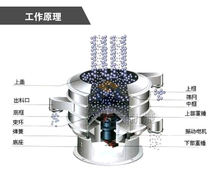 圓形旋振篩主要由進料口、防塵蓋、出料口、束環(huán)、篩網(wǎng)、配重塊、上部重錘、振動體、振動電機、彈簧、下部重錘、機座等部分組成。