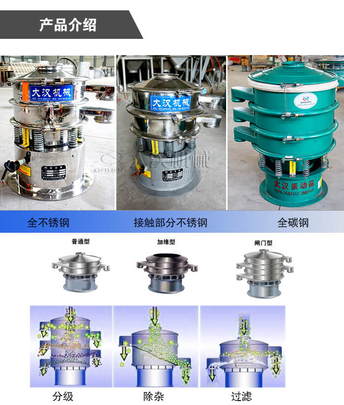 圓形旋振篩又叫圓形三次元旋振篩,主要由碳鋼、不銹鋼及全不銹鋼三種材質(zhì),大漢圓形旋振篩廠家直銷,型號多,關鍵是圓形旋振篩價格便宜,歡迎用戶來咨詢.