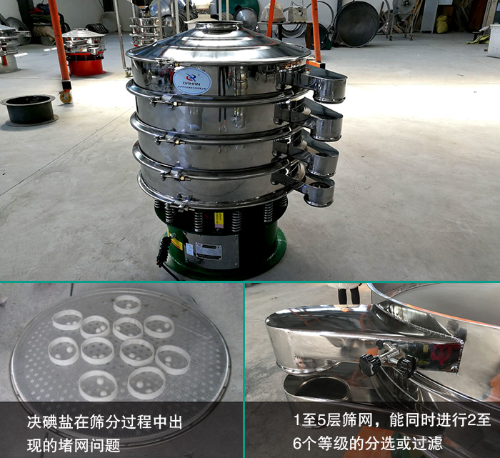 不銹鋼振動篩內(nèi)部裝配有彈跳球清網(wǎng)裝置,可以有效解決碘鹽在篩分過程中出現(xiàn)的堵網(wǎng)問題,提高了篩機的篩分效率。此外,不銹鋼振動篩可篩1至5層篩網(wǎng),能同時進行2至6個等級的分選或過濾,篩分更加高效。